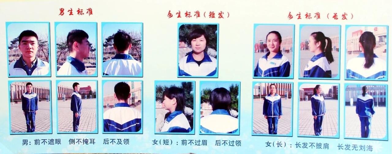 学生应留标准的学生发型,自然、简便、整洁,反映青年学生朝气蓬勃的精神面貌,不烫发,不留披肩发,更不剪成怪异发型。