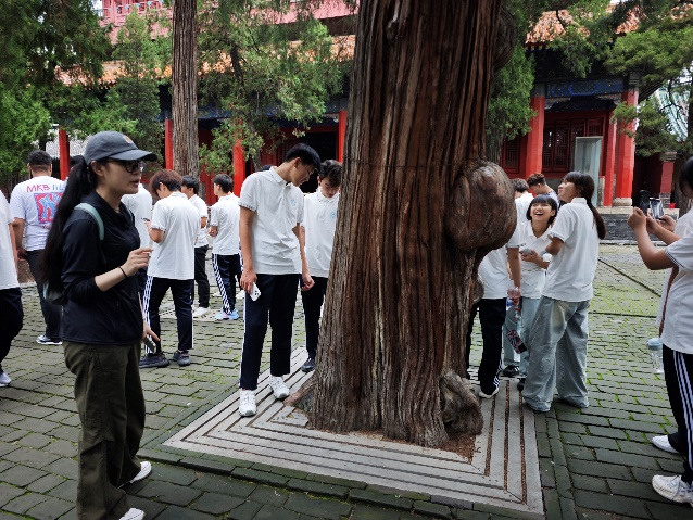 随后前往孔府,教师们重点围绕孔府“官宅合一”的建筑特色与家风家训展开讲解。在“戒贪图”前,库老师详细介绍其“警示廉洁”的寓意,“‘孝悌忠信、礼义廉耻’的家风,不仅是孔氏家族的传承,更是我们每个人应践行的道德准则。”鼓励大家将家风文化融入日常学习生活。